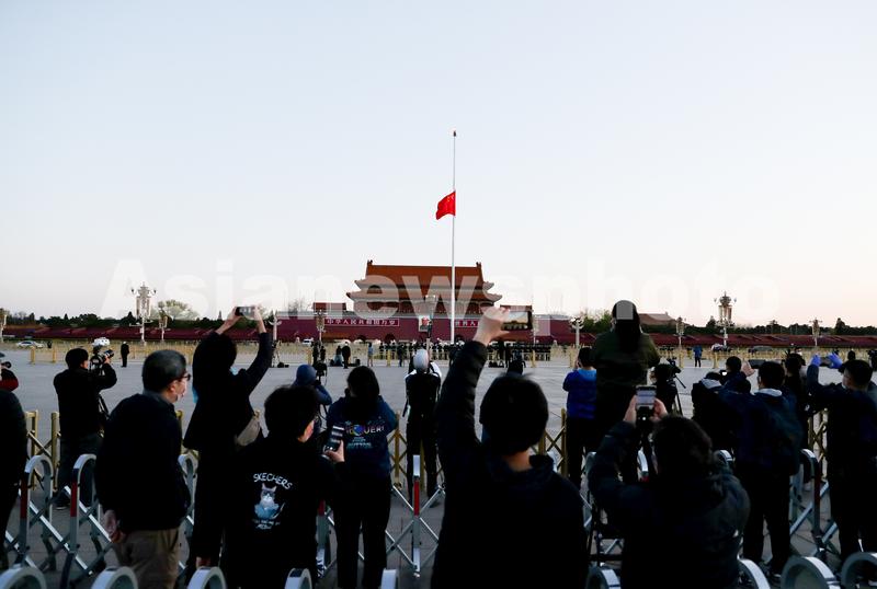 图片说明:4月4日早,天安门广场国旗升起后举行下半旗仪式,群众在广场上观看。