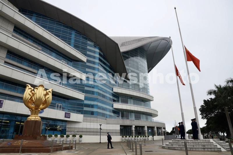 4月4日,香港金紫荆广场举行升旗仪式后下半旗,哀悼新冠肺炎疫情牺牲烈士和逝世同胞。