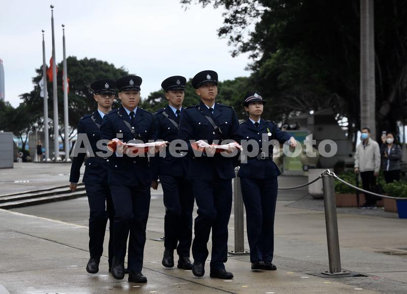4月4日,香港金紫荆广场举行升旗仪式后下半旗,哀悼新冠肺炎疫情牺牲烈士和逝世同胞。