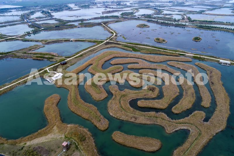 图片说明:2020年4月6日,江苏省淮安市,航拍白马湖湿地公园中的芦苇迷宫。