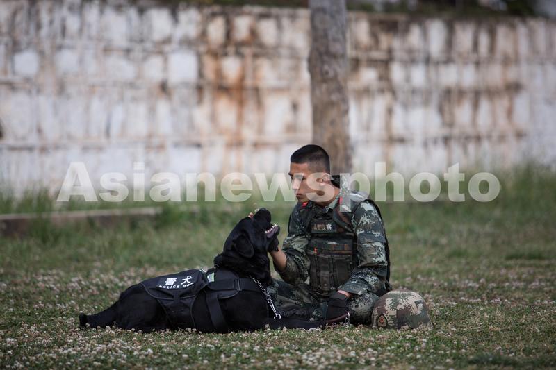 图片说明:2020年4月10日,训导员在体能训练后与警犬嬉闹。