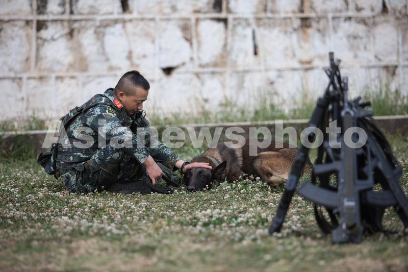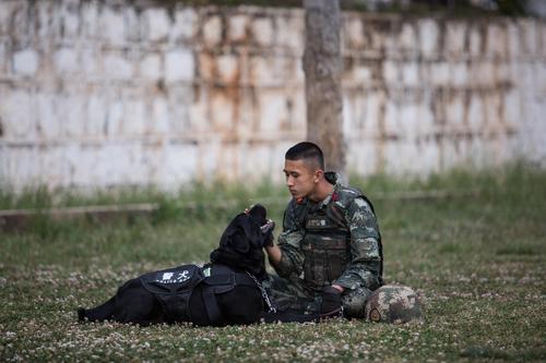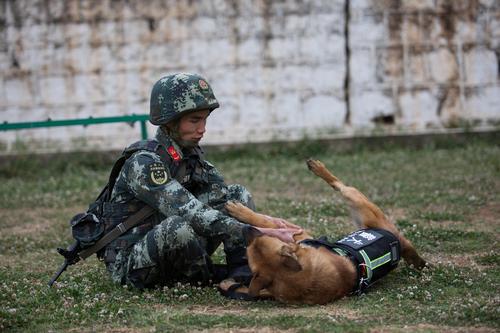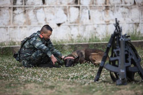 图片说明:2020年4月10日,训导员在体能训练后为警犬放松按摩。
