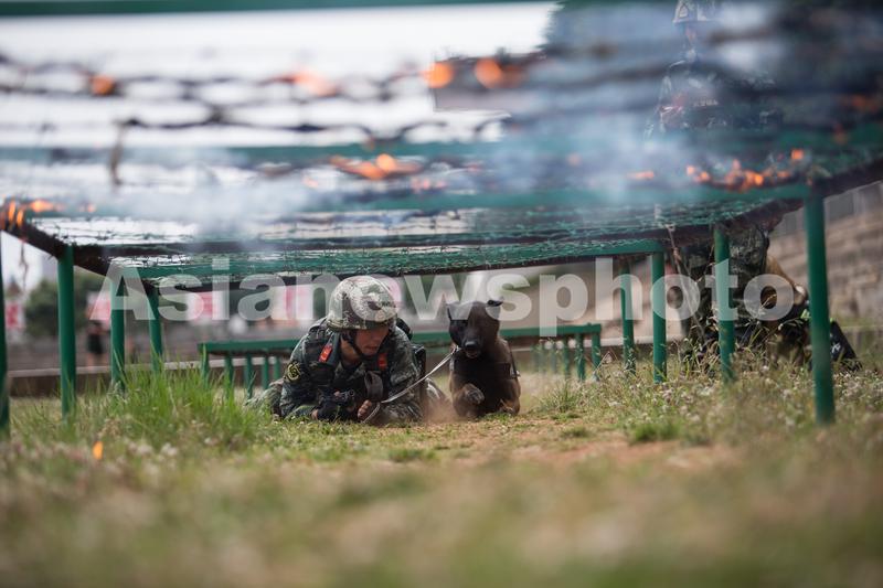 图片说明:2020年4月10日,警犬与训导员协同通过障碍。