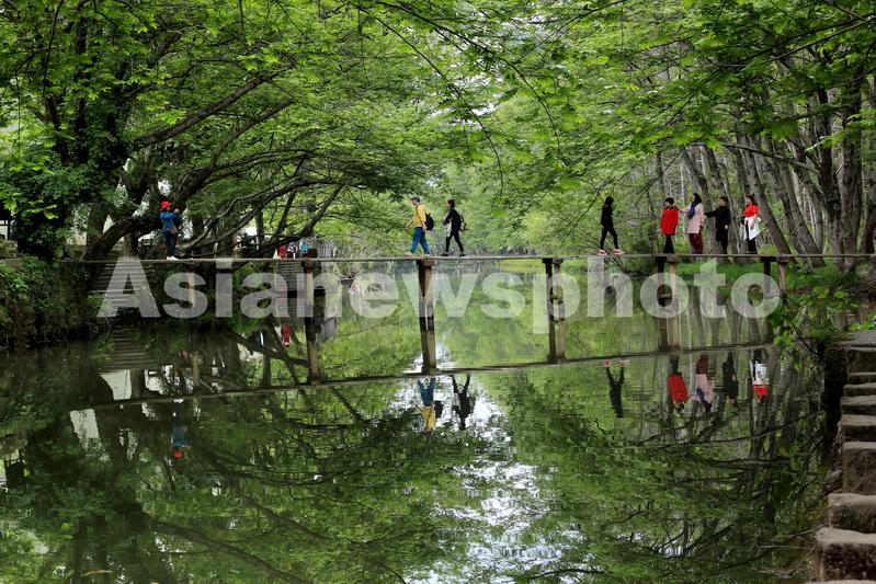 图片说明:2020年4月10日,游客在黄山市徽州西溪南枫杨林湿地公园板凳桥上经过。