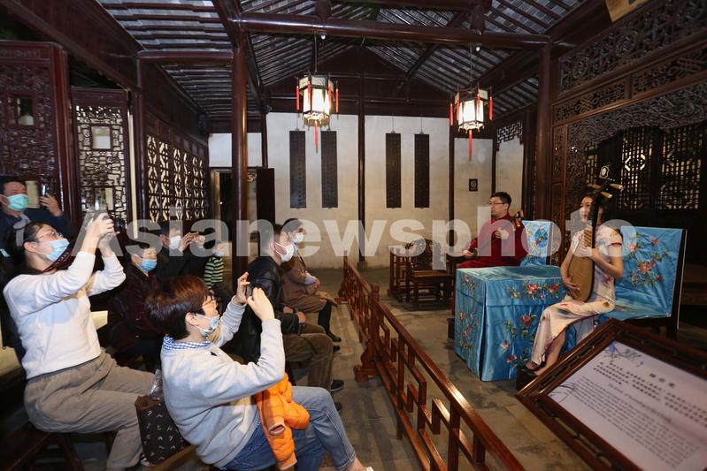 图片说明:4月17日晚,游客在江苏苏州古典园林网师园欣赏苏州评弹。