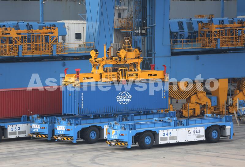 2020年4月17日,在山东港口青岛港全自动化码头,自动导引车来回穿梭运送出口的集装箱。