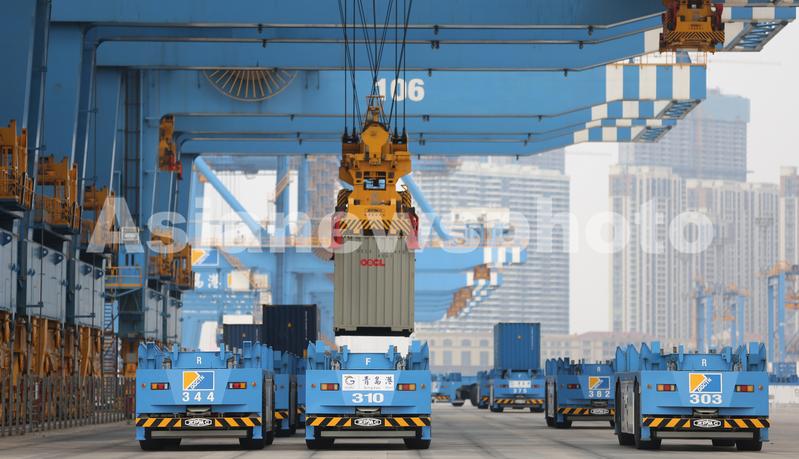 4月17日,在山东港口青岛港全自动化码头,自动导引车来回穿梭运送出口的集装箱。