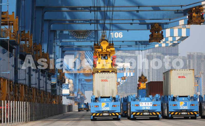 4月17日,在山东港口青岛港全自动化码头,自动导引车来回穿梭运送出口的集装箱。