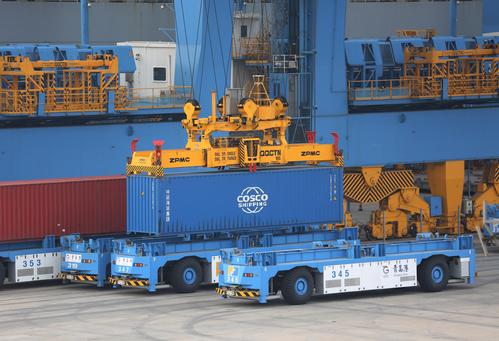 2020年4月17日,在山东港口青岛港全自动化码头,自动导引车来回穿梭运送出口的集装箱。