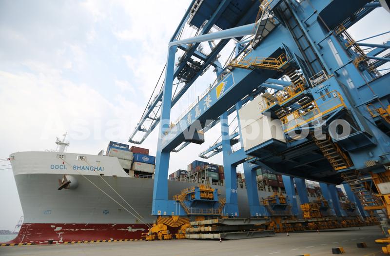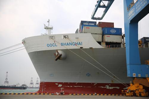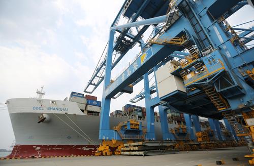 4月17日,在山东港口青岛港全自动化码头,一艘货轮在装载出口的货物。