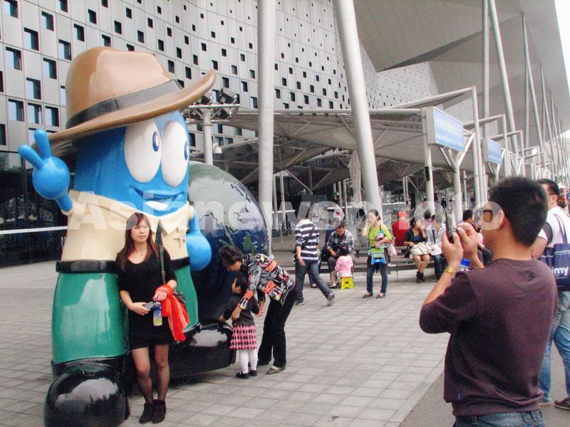 2010年5月31日,中国2010上海世博会十周年回顾:游客与世博会吉祥物海宝合影。