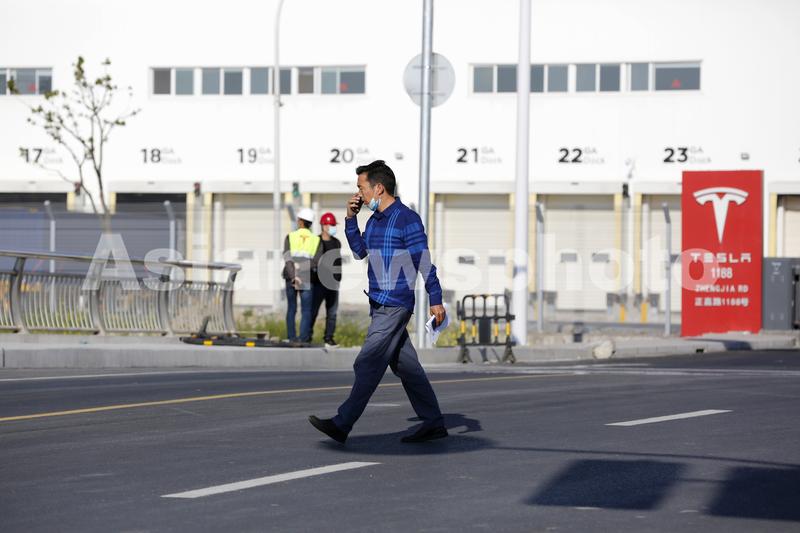 图片说明:2020年4月28日,上海临港,特斯拉上海工厂大门门口。
