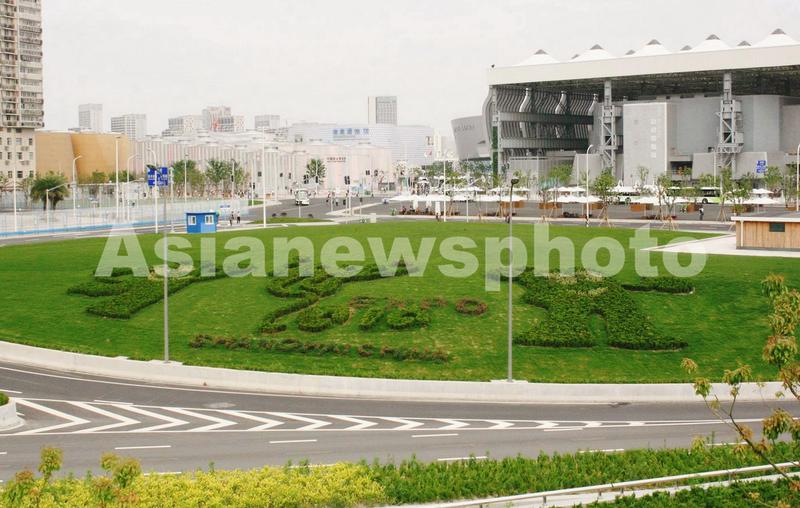 2010年5月29日,中国2010上海世博会十周年回顾:中国船舶馆前的世博会徽标志和吉祥物主题绿化。
