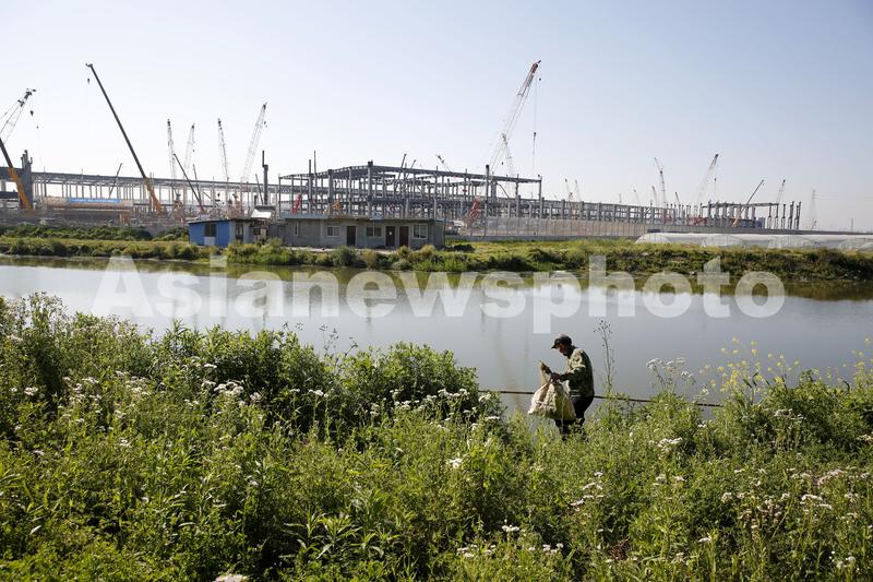 图片说明:2020年4月28日,上海临港,一老鱼民在河边准备捕鱼,其身后为特斯拉上海工厂二期工程。
