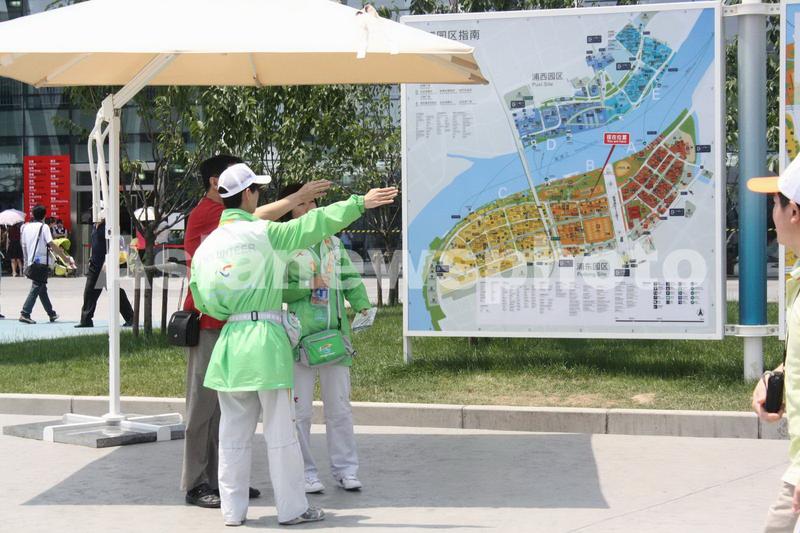 2010年5月31日,中国2010上海世博会十周年回顾:“小白菜”志愿者在世博地图前指引游客。