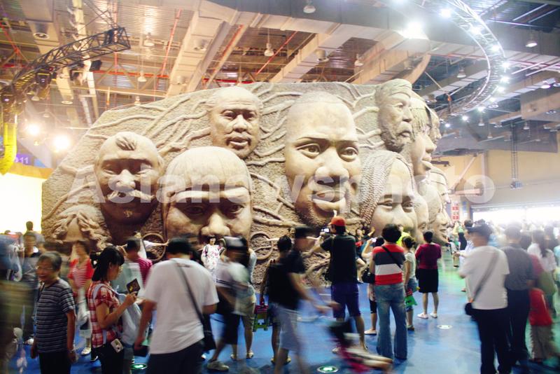 2010年9月17日,中国2010上海世博会十周年回顾:非洲馆的特色黑人面部肖像雕塑。