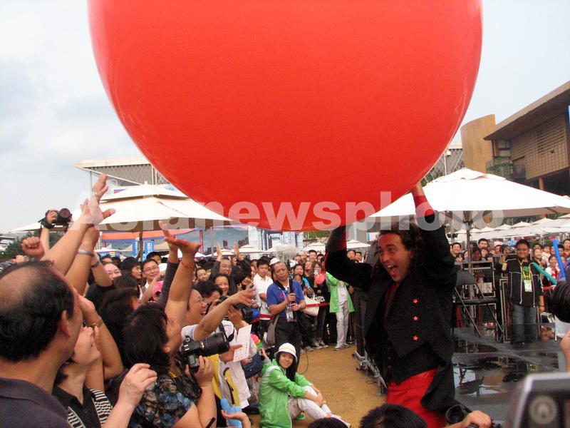 2010年5月29日,中国2010上海世博会十周年回顾:国外气球表演艺术家与游客观众互动。