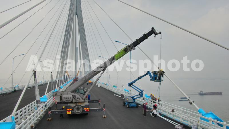 图片说明:2020年5月2日,施工人员在主航道桥公路桥面上更换安装斜拉索阻尼器。