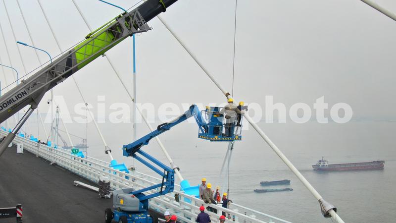 图片说明:2020年5月2日,施工人员在主航道桥公路桥面上更换安装斜拉索阻尼器。