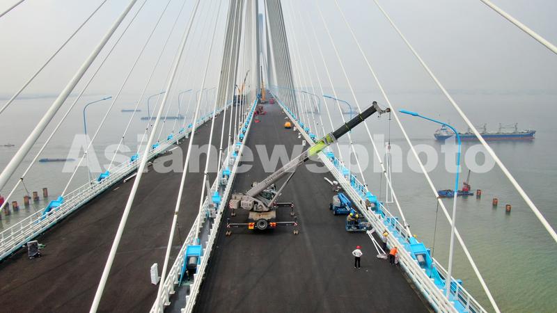 图片说明:2020年5月2日,施工人员在主航道桥公路桥面上更换安装斜拉索阻尼器。