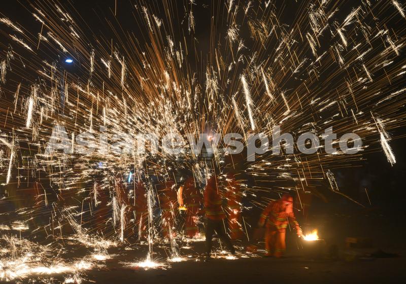 5月3日晚,贵州省普定县秀水景区当地村民在表演“铁水冲龙”。