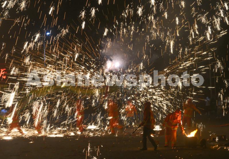 5月3日晚,贵州省普定县秀水景区当地村民在表演“铁水冲龙”。