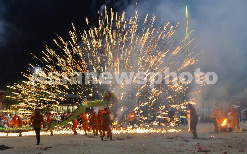 5月3日晚,贵州省普定县秀水景区当地村民在表演“铁水冲龙”。