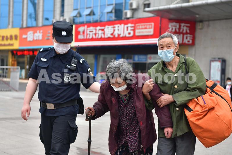 图片说明:2020年5月5日,一名特保在护送两位老人走出阜阳火车站。