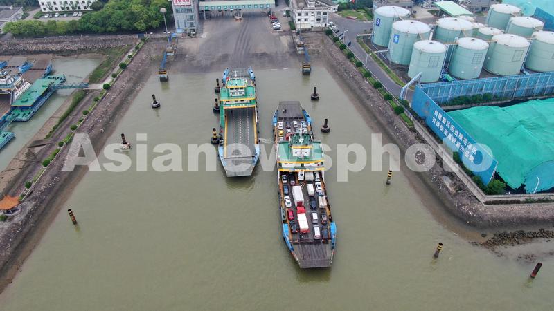 2020年5月6日,在江苏省南通市通沙汽渡拍摄的画面。通沙汽渡是204国道(烟台--上海)上唯一跨越长江的大型现代化汽车渡口。