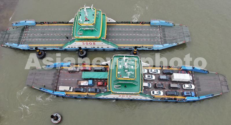 2020年5月6日,在江苏省南通市通沙汽渡拍摄的画面。通沙汽渡是204国道(烟台--上海)上唯一跨越长江的大型现代化汽车渡口。