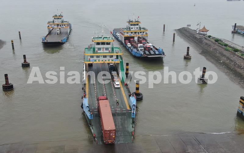 2020年5月6日,在江苏省南通市通沙汽渡拍摄的画面。通沙汽渡是204国道(烟台--上海)上唯一跨越长江的大型现代化汽车渡口。