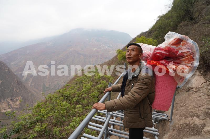 图片说明:5月13日,四川省凉山州昭觉县,“悬崖村”村民走下钢梯时眺望。