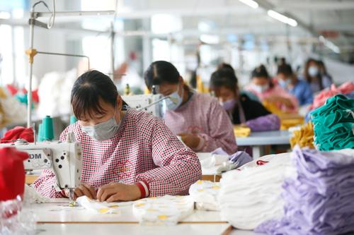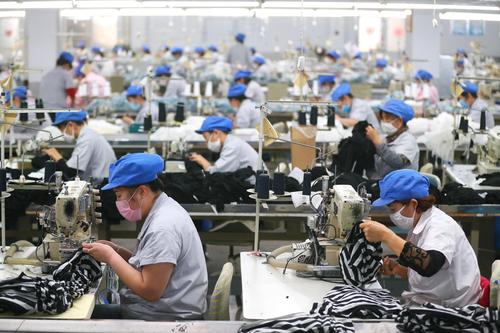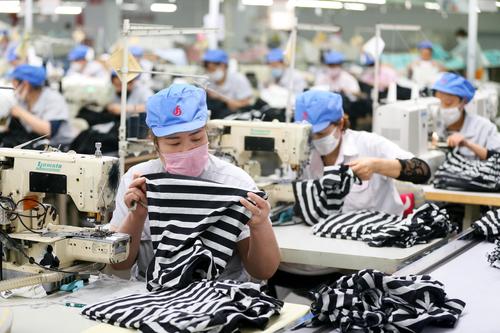 2020年5月15日,山东青岛市即墨区即发集团华泰针织有限公司的工人在生产童装产品。
