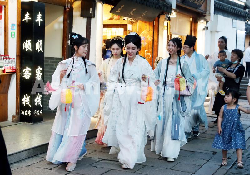 2020年5月19日晚,身穿汉服的女子提灯漫步于周庄古镇幽幽的水巷石板路上。被誉为“中国第一水乡”的苏州周庄传承水乡文化,邀请百名汉服爱好者进行古风舞蹈、投壶、汉韵古乐、礼遇、巡游等汉文化展示,让游客在欣赏水乡的美景时,感受到中华传统文化的魅力。
