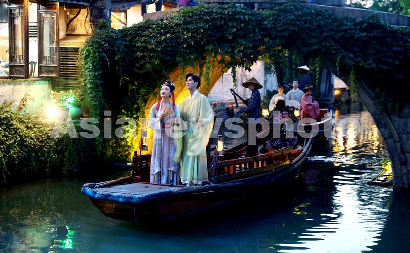 2020年5月19日晚,身穿汉服的年轻人在周庄古镇水巷游览展示。