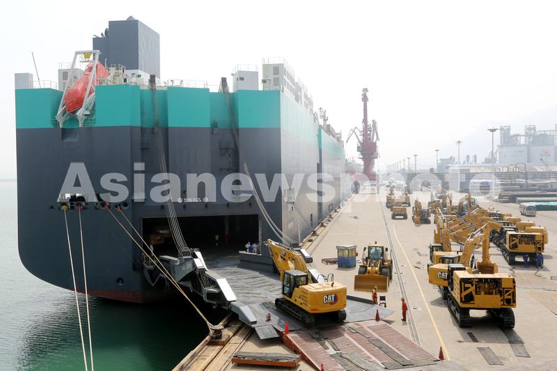 2020年5月17日,一艘远洋滚装轮在连云港港东方公司码头装载我国生产的工程机械设备出口比利时。