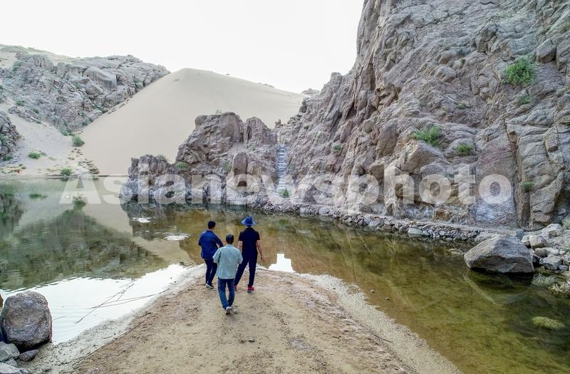 2020年5月19日,旅行者在大漠天池游览(无人机拍摄)。