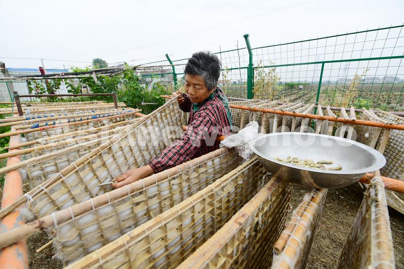 5月25日,江苏海安,隆政街道新丰村蚕业合作社14组蚕农马永凤提笼翻蔟,把好熟蚕“上山”关,着力提高提春茧产量质量。