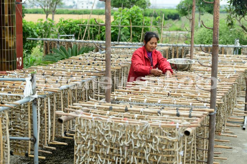 5月25日,江苏海安,隆政街道新丰村蚕业合作社蚕农杨洪美把好熟蚕“上山”关,着力提高提春茧产量质量。