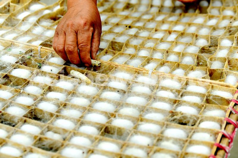 5月25日,江苏海安,隆政街道新丰村蚕业合作社蚕农捉去游山蚕,确保上蔟密度均匀,多结优质蚕茧。