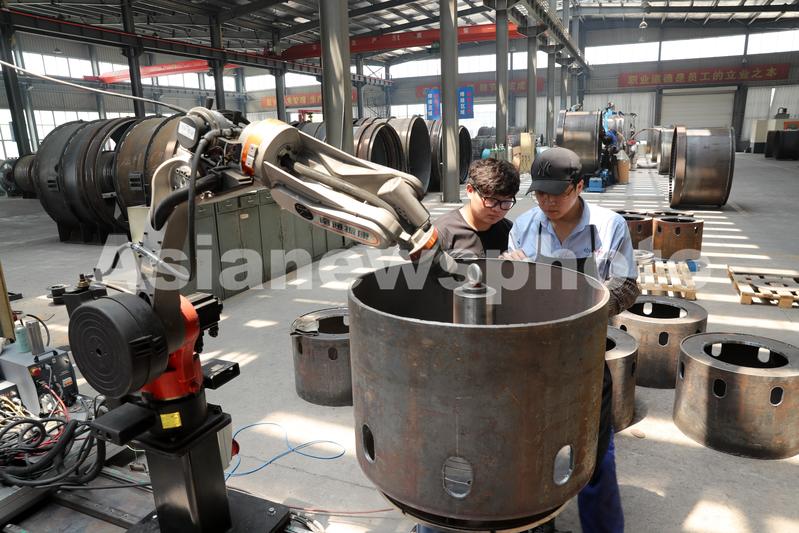 2020年5月24日,焊接机器人在江苏中联风能机械有限公司车间作业。