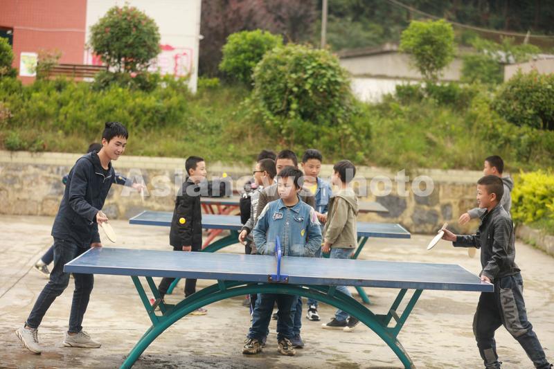 2020年5月27日,在贵州省毕节市黔西县雨朵镇龙场学校,六年级的学生在课间打乒乓球。