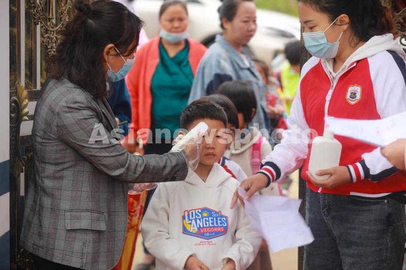 2020年5月27日,在贵州省毕节市黔西县杜鹃街道野坝幼儿园,老师在给进入幼儿园的孩子测量体温。