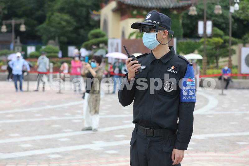 2020年6月2日,浙江舟山普陀山风景名胜区,佩戴有智能测温AR眼镜的旅游警察在执勤。