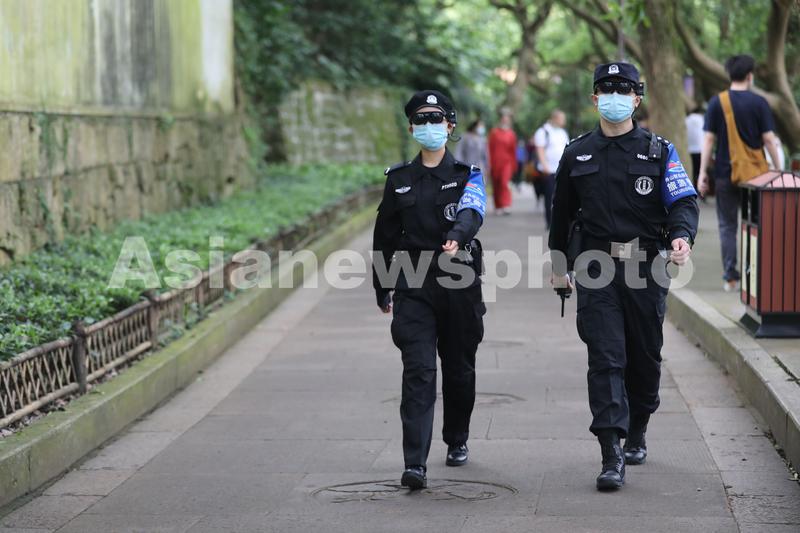 2020年6月2日,浙江舟山普陀山风景名胜区,佩戴有智能测温AR眼镜的旅游警察在执勤。