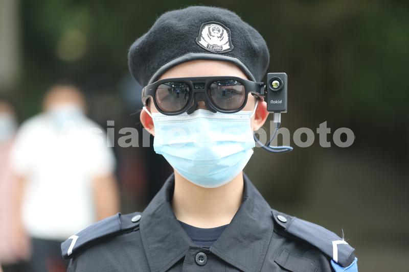 2020年6月2日,浙江舟山普陀山风景名胜区,佩戴有智能测温AR眼镜的旅游警察在执勤。