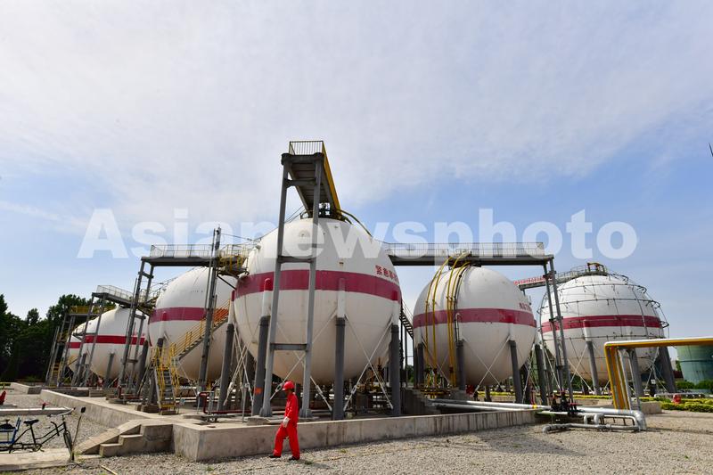 2020年6月2日,河南濮阳,中国石化中原油田天然气处理厂轻烃站职工对轻烃罐工进行安全检查,对罐区10条总长约130余米的液位计连通管线进行保温拆除、打磨防腐、喷刷防腐漆,保障轻烃站的安全平稳运行。