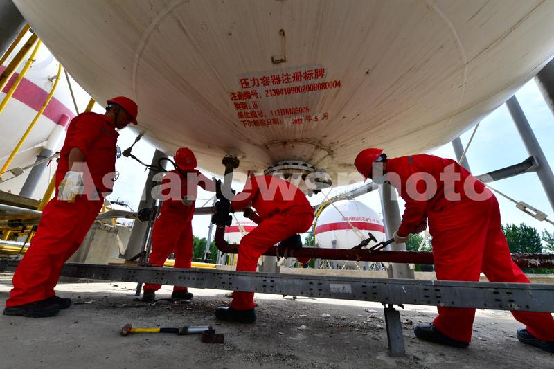 2020年6月2日,河南濮阳,中国石化中原油田天然气处理厂轻烃站职工对轻烃罐工进行安全检查,对罐区10条总长约130余米的液位计连通管线进行保温拆除、打磨防腐、喷刷防腐漆,保障轻烃站的安全平稳运行。