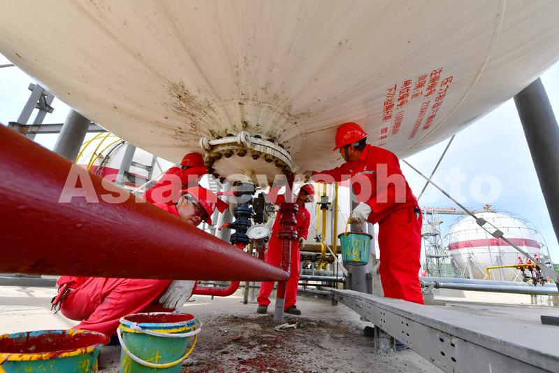 2020年6月2日,河南濮阳,中国石化中原油田天然气处理厂天然气处理厂轻烃站职工对轻烃罐工艺管线喷刷防腐。