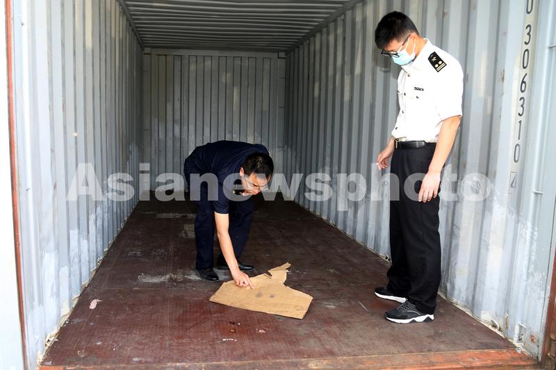 2020年6月1日,在宁波舟山港大浦口港区空箱检疫区,杭州海关所属舟山海关关员对完成检疫熏蒸处理的进境集装箱空箱进行效果评价,并现场处理了已被熏蒸死亡的若干只美洲大蠊。